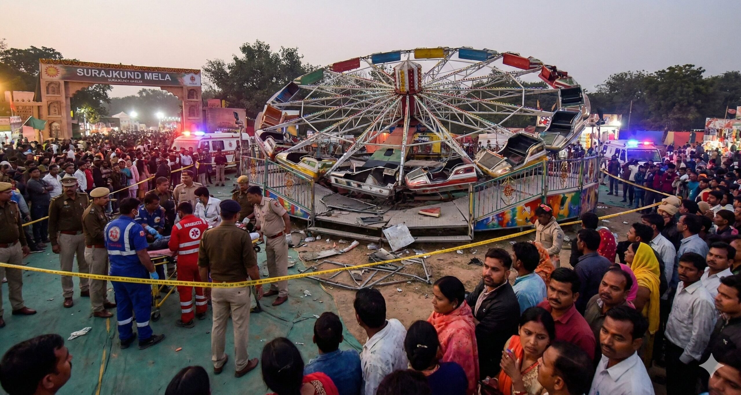 ஹரியானா மாநிலம் ஃபரிதாபாத் (Faridabad) நகரில் நடைபெற்று வரும் புகழ்பெற்ற சூரஜ்குண்ட் மேளாவில் (Surajkund Mela), ராட்சத ராட்டினம் (High-speed Swing) ஒன்று அறுந்து விழுந்ததில், பணியில் இருந்த போலீஸ் இன்ஸ்பெக்டர் ஒருவர் பரிதாபமாக உயிரிழந்தார். மேலும் பலர் படுகாயமடைந்துள்ளனர்.