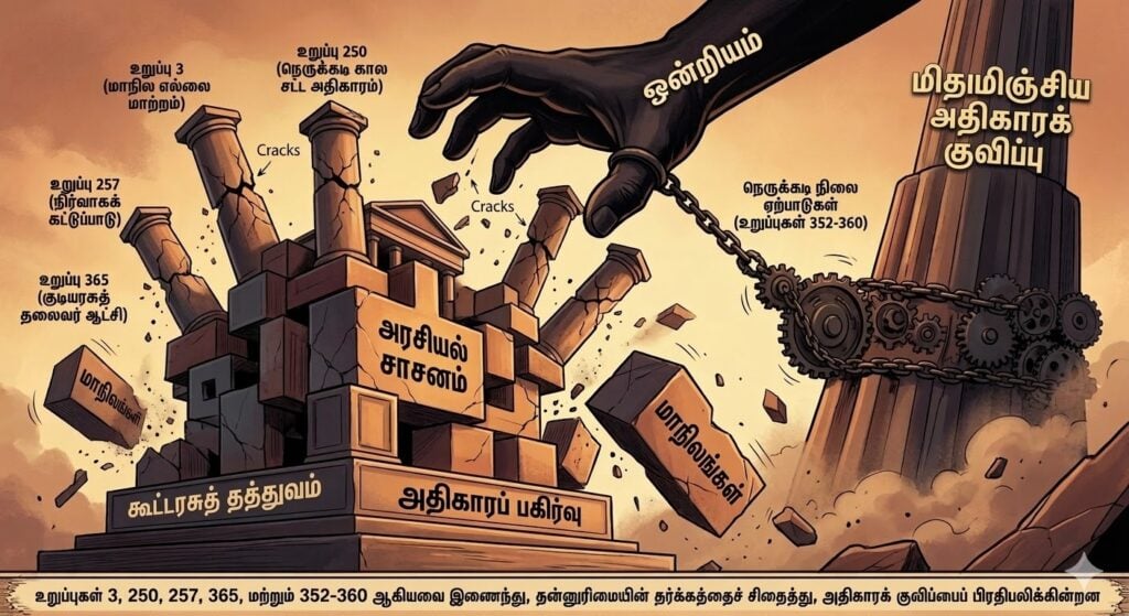 - நெருக்கடி நிலை ஏற்பாடுகள் (உறுப்புகள் 352-360) ஆகியவை கூட்டாக இணைந்து, நடைமுறையில் அதிகாரப் பகிர்வைப் பாதுகாத்து நிற்கும் தன்னுரிமையின் தர்க்கத்தைச் சிதைத்து, மிதமிஞ்சிய அதிகாரக் குவிப்பைப் பிரதிபலிக்கின்றன.
