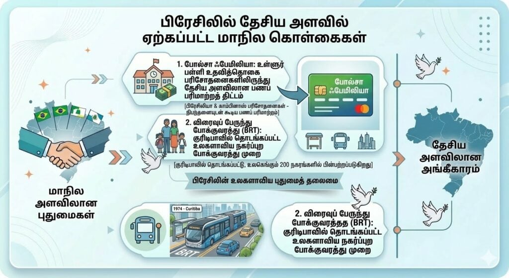 பிரேசிலில், போல்சா ஃபேமிலியா (Bolsa Família, நிபந்தனையுடன் கூடிய பணப் பரிமாற்றம்) எனும் திட்டம் பிரேசிலியா, காம்பினாஸ் போன்ற பகுதிகளில் மேற்கொள்ளப்பட்ட போல்சா எஸ்கோலா (பள்ளி உதவித்தொகை) போன்ற உள்ளூர் அளவிலான பரிசோதனைகளிலிருந்து உருவானது. அதேபோல், விரைவுப் பேருந்து போக்குவரத்து (Bus Rapid Transit) முறை 1974-இல் குரிடிபாவில் பரிசோதனையாகத் தொடங்கப்பட்டு, இன்று உலகம் முழுவதும் 200-க்கும் மேற்பட்ட நகரங்களில் பின்பற்றப்படுகிறது.