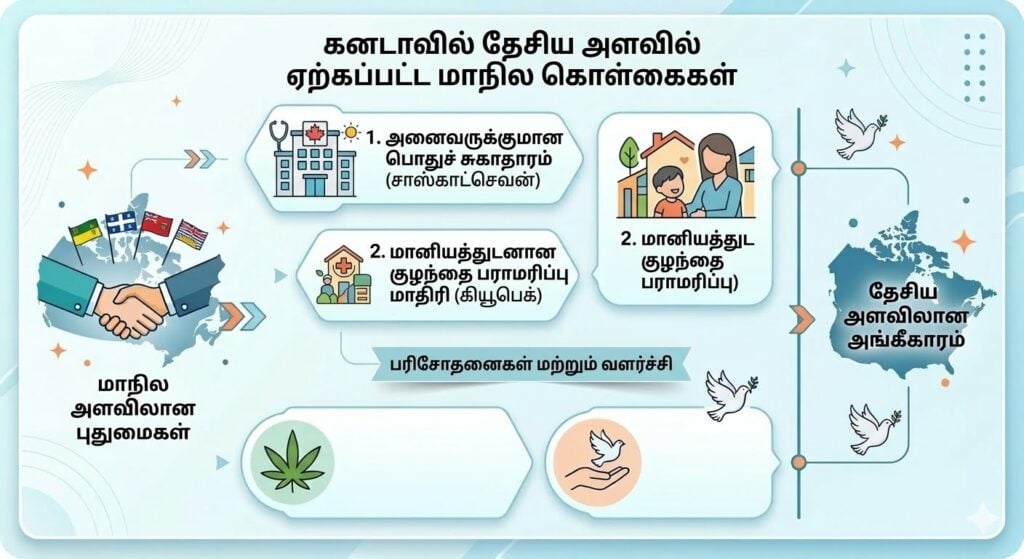 கனடாவில், அனைவருக்குமான பொதுச் சுகாதாரம் தேசிய திட்டமாவதற்கு முன்பு சாஸ்காட்செவன் (Saskatchewan) மாகாணத்தில்தான் உருவானது. கியூபெக் (Quebec) மாகாணத்தின் மானியத்துடனான குழந்தை பராமரிப்பு மாதிரி, இப்போது கூட்டாட்சி அரசின் குடும்பக் கொள்கையை வடிவமைத்து வருகிறது.