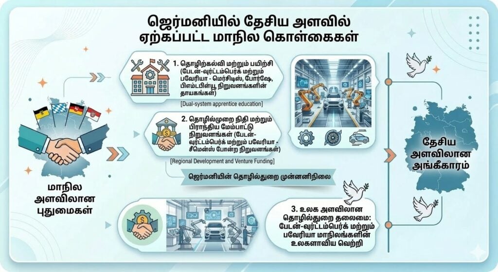 ஜெர்மனியில், (மெர்சிடிஸ், போர்ஷே நிறுவனங்களின் தாயகமான) பேடன்-வுர்ட்டம்பெர்க், (பிஎம்டபிள்யூ, சீமென்ஸ் நிறுவனங்களின் தாயகமான) பவேரியா போன்ற மாநிலங்கள் தொழிற்கல்வி, தொழில்முறை நிதி, பிராந்திய மேம்பாட்டு நிறுவனங்கள் ஆகியவற்றின் மீதான கட்டுப்பாட்டின் வழியாக உலக அளவில் தொழில்துறை முன்னணிநிலையை தக்கவைத்துக் கொள்கின்றன.