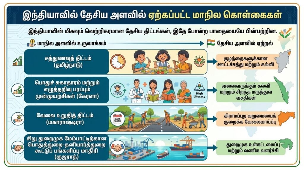 இந்தியாவின் மிகவும் வெற்றிகரமான தேசிய திட்டங்கள், இதே போன்ற பாதையையே பின்பற்றின. சத்துணவுத் திட்டம் (தமிழ்நாடு), பொதுச் சுகாதாரம் மற்றும் எழுத்தறிவு பரப்பும் முன்முயற்சிகள் (கேரளா), வேலை உறுதித் திட்டம் (மகாராஷ்டிரா), சிறு துறைமுக மேம்பாட்டிற்கான பொதுத்துறை-தனியார்த்துறை கூட்டுப் பங்களிப்பு மாதிரி (குஜராத்) ஆகிய அனைத்தும் பரந்த அளவில் ஏற்றுக்கொள்வதற்கு முன்னரே, மாநில அளவில் உருவானவை.