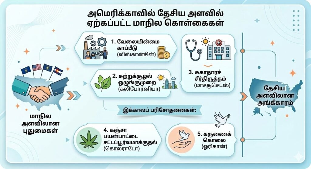 அமெரிக்காவில், வேலையின்மை காப்பீடு (விஸ்கான்சின்), சுற்றுச்சூழல் ஒழுங்குமுறை (கலிபோர்னியா), சுகாதாரச் சீர்திருத்தம் (மாசசூசெட்ஸ்) போன்ற முக்கியமான கொள்கை வகுப்பு புதுமைகள் தேசிய அளவில் ஏற்றுக்கொள்ளப்படுவதற்கு முன்பு, மாநிலங்களிலேயே தொடங்கின. இக்காலப் பரிசோதனைகளாக (கொலராடோ, ஓரிகான் மாகாணங்களில்) கஞ்சா பயன்பாட்டை சட்டப்பூர்வமாக்குதல், கருணைக் கொலை ஆகியவற்றைக் குறிப்பிடலாம்.