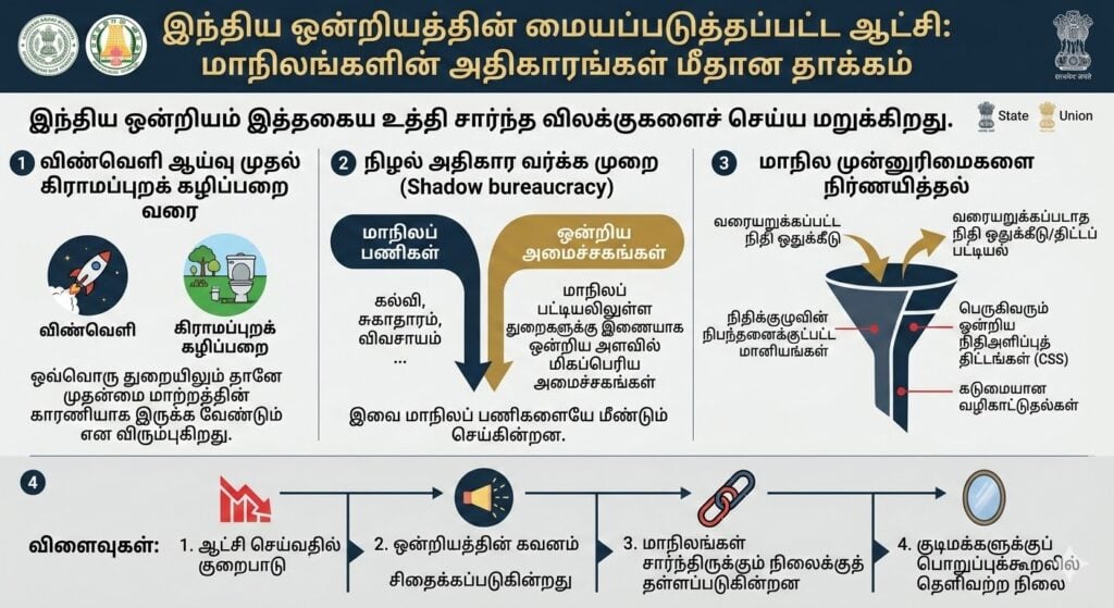 இப்போது, இந்திய ஒன்றியம் இத்தகைய உத்தி சார்ந்த விலக்குகளைச் செய்ய மறுக்கிறது. விண்வெளி ஆய்வு முதல் கிராமப்புறக் கழிப்பறை வரை ஒவ்வொரு துறையிலும் தானே முதன்மை மாற்றத்தின் காரணியாக இருக்க வேண்டும் என விரும்புகிறது. மாநிலப் பட்டியலில் உள்ள ஒவ்வொரு துறைக்கும் இணையாக ஒன்றிய அளவில் மிகப்பெரிய அமைச்சகங்கள் உள்ளன; இவை மாநிலப் பணிகளையே மீண்டும் செய்யும் ஒரு “நிழல் அதிகார வர்க்க முறையை” (Shadow bureaucracy) உருவாக்குகின்றன. நிதிக் குழுவின் நிபந்தனைக்குட்பட்ட மானியங்கள், பெருகிவரும் ஒன்றிய நிதிஅளிப்புத் திட்டங்கள் (Centrally Sponsored Schemes), கடுமையான வழிகாட்டுதல்கள் ஆகியவற்றின் மூலம், வரையறுக்கப்படாத நிதி ஒதுக்கீட்டையும் திட்டங்களின் தெரிவுப் பட்டியலையும் வழங்குவதற்குப் பதிலாக, வரையறுக்கப்பட்ட நிதி ஒதுக்கீடு வழங்குவதன் வழியாகவும் மாநிலங்களின் முன்னுரிமைகளை ஒன்றிய அரசு தீர்மானிக்கிறது. இதன் விளைவாக, ஆட்சி செய்வதில் குறைபாடு ஏற்படுகின்றது. இதனால், ஒன்றியத்தின் கவனம் சிதைக்கப்படுகின்றது. மாநிலங்கள் சார்ந்திருக்கும் நிலைக்குத் தள்ளப்படுகின்றன. குடிமக்களுக்குப் பொறுப்புக்கூறலில் தெளிவற்ற நிலை நிலவுகிறது.