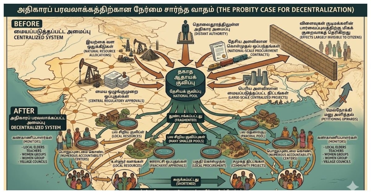 வரலாற்றுரீதியாக, இந்தியாவின் மிகப்பெரிய ‘தகாத ஆதாயக் குவிப்புகள்’ (rent pools) எங்குத் தன்னிச்சையான அதிகாரங்கள் அதிகம் குவிக்கப்பட்டுள்ளதோ, எங்கு அவற்றின் விளைவுகள் குடிமக்களின் பார்வைப்புலத்திற்கு மிகக் குறைவாகத் தெரிகிறதோ அங்கேயே உருவாகியுள்ளன: இயற்கை வள ஒதுக்கீடுகள், மைய ஒழுங்குமுறை ஒப்புதல்கள் (central regulatory approvals), தேசிய அளவிலான கொள்முதல் ஒப்பந்தங்கள் மற்றும் பெரிய அளவிலான மையப்படுத்தப்பட்ட திட்டங்கள் ஆகியவையே அவை. எனவே, அதிகாரப் பரவலாக்கத்திற்கான நேர்மை சார்ந்த வாதம் (probity case) மிகவும் நேரடியானது: