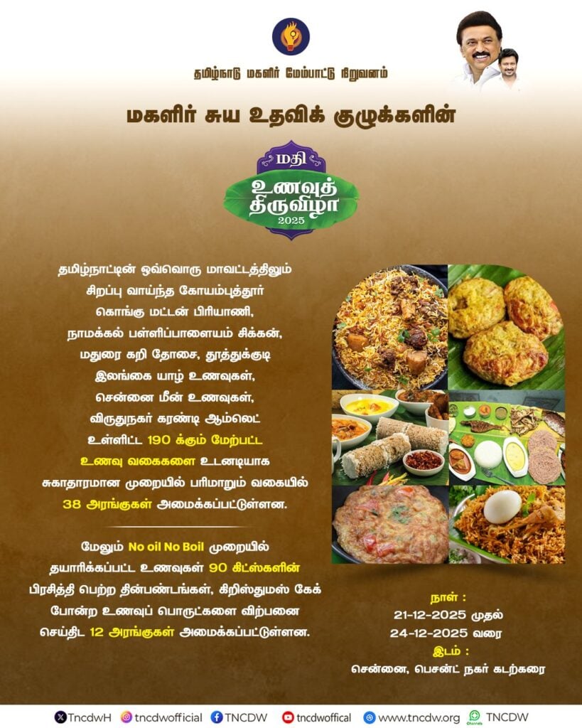 தமிழ்நாடு மகளிர் மேம்பாட்டு நிறுவனம் சார்பில், மகளிர் சுய உதவிக் குழுக்களின் கைவண்ணத்தில் உருவான பாரம்பரிய உணவுகளை அறிமுகப்படுத்தும் உணவுத் திருவிழா சென்னை பெசன்ட் நகரில் இன்று (டிசம்பர் 21) மாலை தொடங்குகிறது.