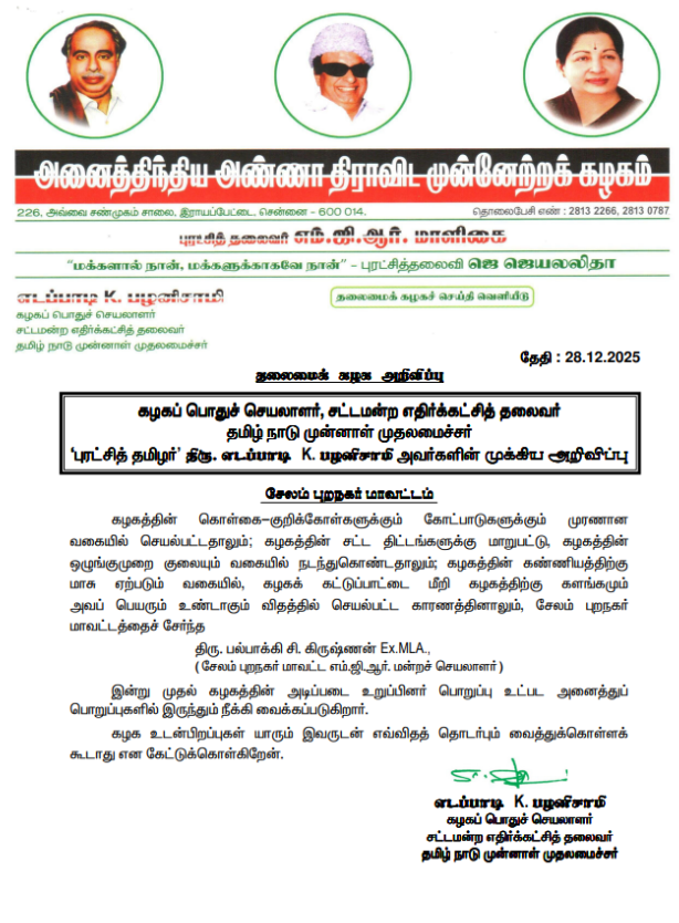 சேலம் புறநகர் மாவட்ட எம்ஜிஆர் மன்றச் செயலாளர் பல்பாக்கி சி.கிருஷ்ணனை இன்று (டிசம்பர் 28) கட்சியில் இருந்து நீக்கி எடப்பாடி பழனிசாமி உத்தரவிட்டுள்ளார்.’