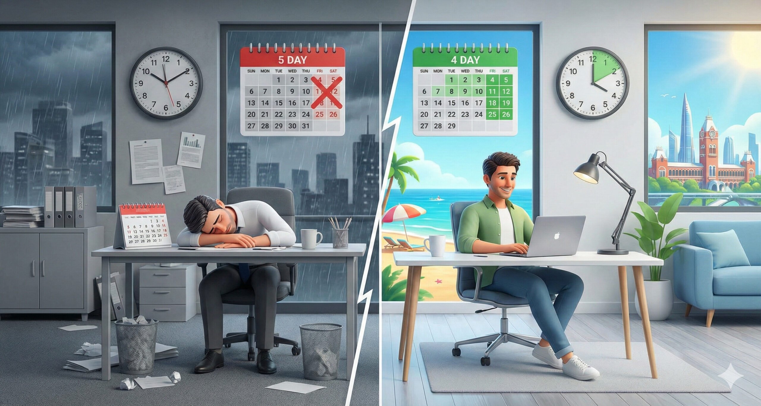 மொத்தத்தில்: “அதிக நேரம் வேலை செய்வதுதான் கடின உழைப்பு” என்ற பழைய சித்தாந்தம் உடைந்து, “ஸ்மார்ட்டாக வேலை செய்வதுதான் (Smart Work) வளர்ச்சி,” என்ற புதிய பாதை திறந்துள்ளது. வாரத்திற்கு 3 நாட்கள் விடுமுறை கிடைத்தால், குடும்பத்துடனும், குழந்தைகளுடனும் நேரத்தைச் செலவிடலாம்; உடற்பயிற்சி செய்யலாம்; நிம்மதியாகத் தூங்கலாம்.