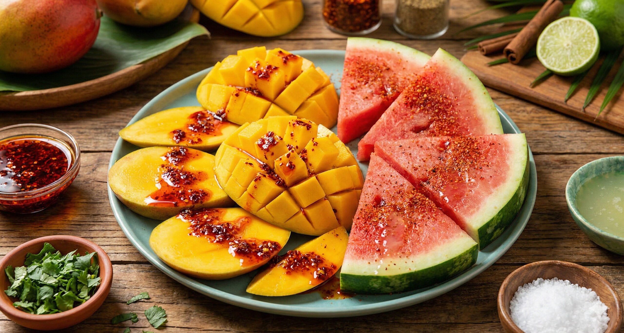 - தர்பூசணி + தாஜின் (Watermelon & Tajín): மெக்சிகன் ஸ்டைல் மசாலாவான ‘தாஜின்’ (மிளகாய் தூள், எலுமிச்சை மற்றும் உப்பு கலந்தது) தர்பூசணி மீது தூவிச் சாப்பிடுவது கோடை காலத்திற்கு ஒரு ‘ஜாக்பாட்’ காம்போ!