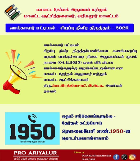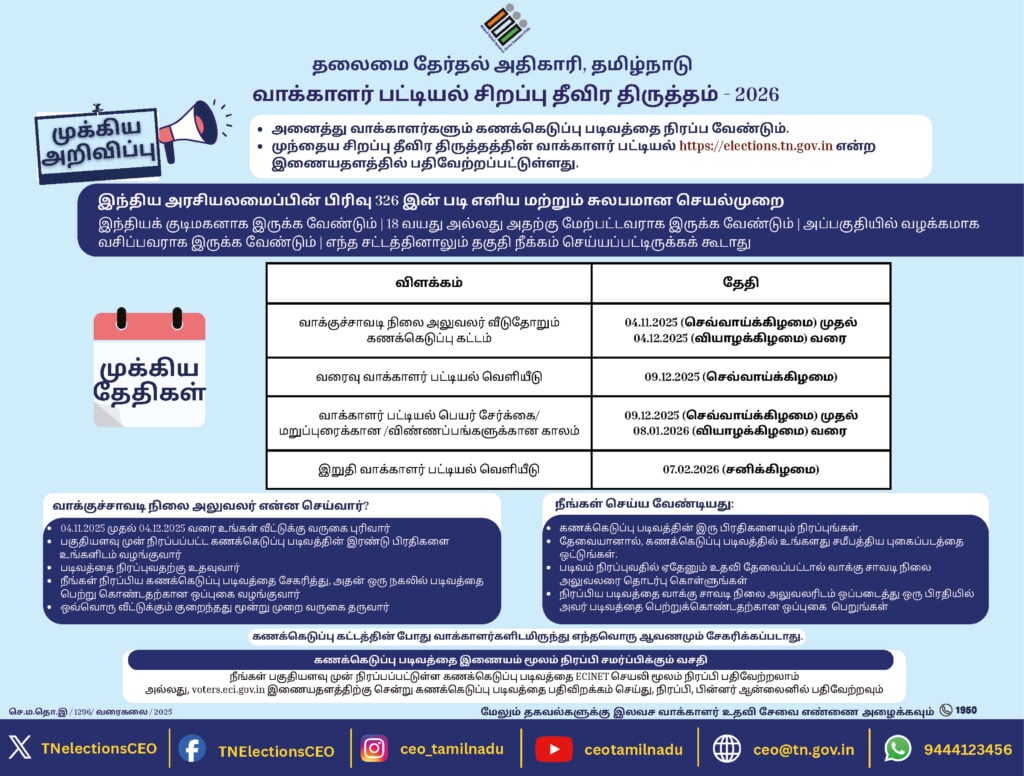 - சிறப்புத் தீவிரத் திருத்தப் பணிகள்: அக்டோபர் 28, 2025 முதல் பிப்ரவரி 7, 2026 வரை நடைபெறும்.
