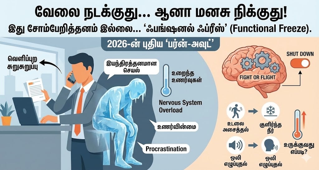 “எனக்கு என்னாச்சு? ஏன் எதிலும் ஆர்வமில்லை?” என்று உங்களைக் குழப்பும் இந்த நிலைக்குப் பெயர்தான் ‘ஃபங்ஷனல் ஃப்ரீஸ்’ (Functional Freeze). இதுதான் 2026-ன் புதிய ‘பர்ன்-அவுட்’ (New Burnout).
