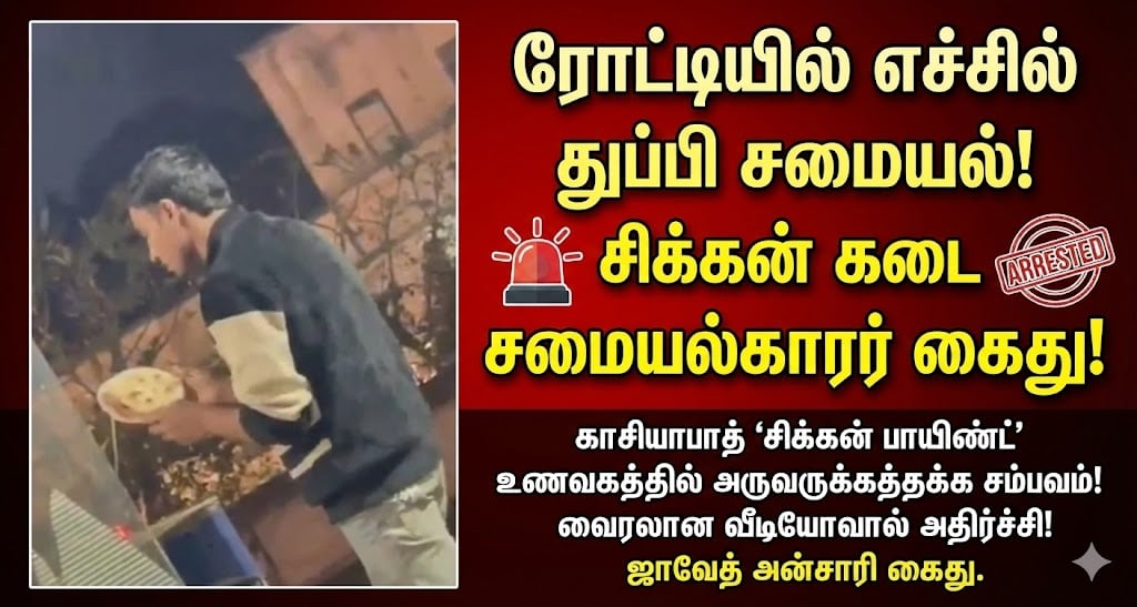 வைரலான வீடியோ: காசியாபாத்தில் ‘சிக்கன் பாயிண்ட்’ (Chicken Point) என்ற பெயரில் பிரபல அசைவ உணவகம் ஒன்று செயல்பட்டு வருகிறது. இங்கு ஜாவேத் அன்சாரி (Javed Ansari) என்பவர் சமையல் கலைஞராகப் பணிபுரிந்து வருகிறார். நேற்று (ஜனவரி 8) சமூக வலைதளங்களில் வீடியோ ஒன்று தீயாய் பரவியது. அந்த வீடியோவில், ஜாவேத் அன்சாரி தந்தூரி அடுப்பில் ரோட்டி சுடுவதற்குத் தயார் செய்கிறார். மாவைத் தேய்த்து அடுப்பில் ஒட்டுவதற்கு முன்பு, அவர் அந்த மாவின் மீது எச்சில் துப்புவது (Spitting) போன்ற காட்சி தெளிவாகப் பதிவாகியிருந்தது.