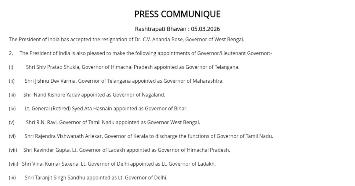 மேற்கு வங்கம் மற்றும் லடாக் ஆளுநர்கள் ராஜினாமா செய்த நிலையில் தமிழ்நாடு, தெலுங்கானா, இமாச்சல பிரதேசம் , டெல்லி, பீகார் ஆளுநர்கள் மாற்றப்பட்டுள்ளனர்.