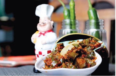 வாணலியில் நல்லெண்ணெய்விட்டு சூடானதும் கடுகு, சீரகம் தாளித்து பச்சை மிளகாய், இஞ்சித் துருவல், உப்பு, பெருங்காயத்தூள், மஞ்சள்தூள், மிளகாய்த்தூள் சேர்த்து சிறிது நேரம் புரட்டவும். பச்சை மிளகாய் நீரெல்லாம் இறங்கும்.