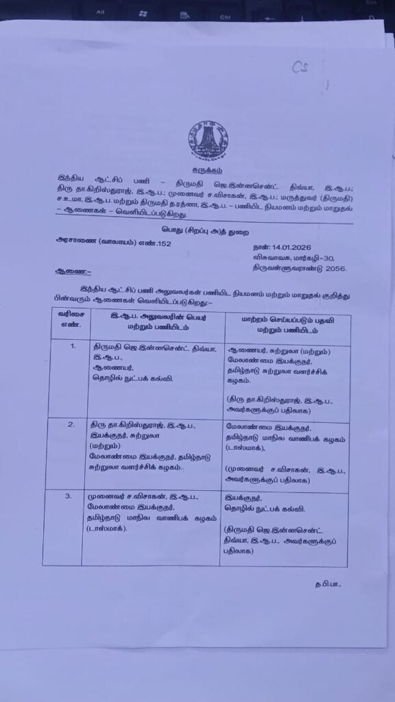 1. தொழில்நுட்ப கல்வி ஆணையர் இன்னசென்ட் திவ்யா தமிழ்நாடு சுற்றுலா வளர்ச்சி கழக ஆணையர்/சுற்றுலா மேலாண்மை இயக்குனராகவும்,
