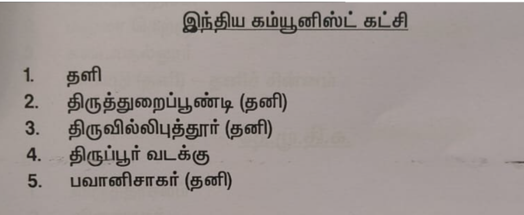 1.தளி, 2.திருத்துறைப்பூண்டி (தனி), 3.திருவில்லிபுத்தூர் (தனி), 4.திருப்பூர் வடக்கு 5.பவானிசாகர் (தனி) ஆகிய 5 தொகுதிகள் ஒதுக்கப்பட்டுள்ளன.
