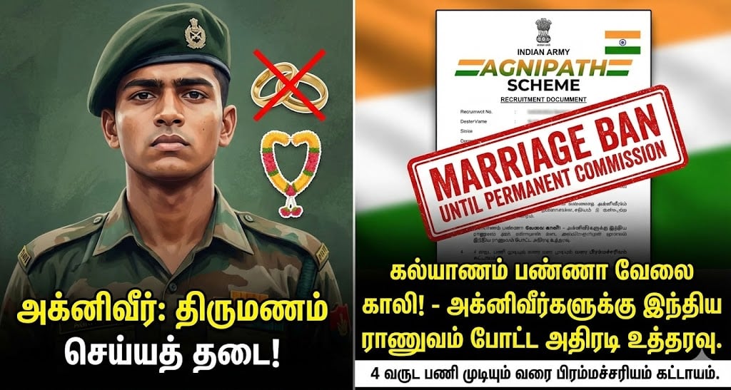 இந்திய ராணுவத்தில் சேரத் துடிக்கும் இளைஞர்களுக்கு ஒரு மிக முக்கியமான மற்றும் அதிர்ச்சிகரமான செய்தி வெளியாகியுள்ளது. மத்திய அரசின் லட்சியத் திட்டமான ‘அக்னிபாத்’ (Agnipath Scheme) மூலம் ராணுவத்தில் இணையவிருக்கும் ‘அக்னிவீர்கள்’, தங்களது பணிக்காலத்தில் திருமணம் செய்துகொள்ளக் கடுமையான தடை விதிக்கப்பட்டுள்ளது.
