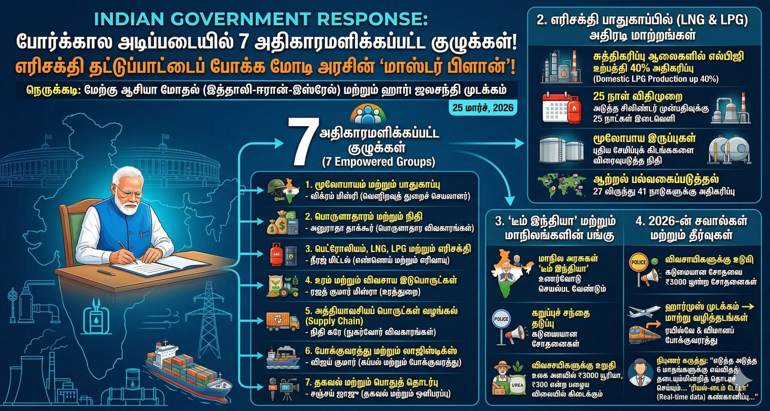 மேற்கு ஆசியாவில் (இத்தாலி-ஈரான்-இஸ்ரேல் மோதல்) நிலவி வரும் போர்ச் சூழல் மற்றும் ஹார்முஸ் ஜலசந்தி முடக்கம் ஆகியவற்றால் ஏற்பட்டுள்ள உலகளாவிய நெருக்கடியைச் சமாளிக்க இந்திய அரசு அதிரடி நடவடிக்கைகளை எடுத்துள்ளது. இந்தச் சூழலில், போரினால் ஏற்படும் உள்நாட்டுப் பாதிப்புகளைக் குறைக்கவும், குறிப்பாக எல்என்ஜி (LNG) மற்றும் எல்பிஜி (LPG) போன்ற எரிசக்தி விநியோகத்தை உறுதி செய்யவும் பிரதமர் நரேந்திர மோடியின் இந்த Indian Government Response மிகப்பெரிய நம்பிக்கையை அளித்துள்ளது. கோவிட்-19 பெருந்தொற்றின் போது அமைக்கப்பட்டதைப் போலவே, தற்போது ஏழு அதிகாரமளிக்கப்பட்ட குழுக்கள் (Empowered Groups) அமைக்கப்பட்டு, அவை போர்க்கால அடிப்படையில் செயல்படத் தொடங்கியுள்ளன.