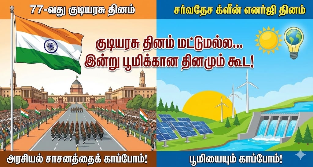 இந்தியா முன்னோடி: இந்த இரண்டு தினங்களும் (குடியரசு தினம் மற்றும் க்ளீன் எனர்ஜி தினம்) ஒரே நாளில் வருவது இந்தியாவுக்குப் பெருமை. ஏனெனில், சூரிய சக்தி உற்பத்தியில் இந்தியா உலகிற்கே வழிகாட்டியாகத் திகழ்கிறது. இன்றைய குடியரசு தின அணிவகுப்பில்கூட, மின்துறை அமைச்சகம் “பிரகாஷ் கங்கா” (Prakash Ganga) என்ற அலங்கார ஊர்தியை நிறுத்தியிருந்தது. இது இந்தியாவின் தூய்மையான எரிசக்திப் புரட்சியைப் பறைசாற்றுவதாக அமைந்தது.