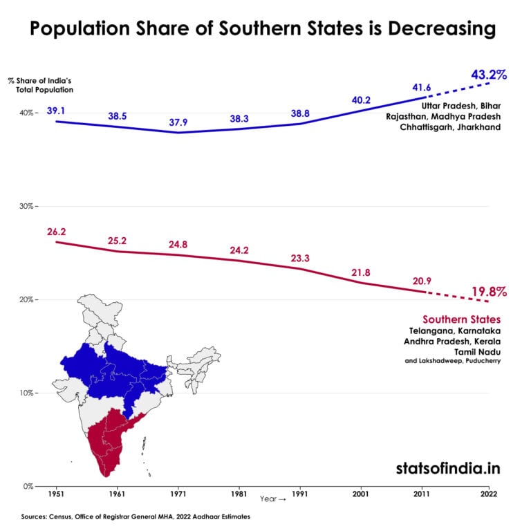 1951 இல் மொத்த இந்திய மக்கள் தொகையில் வட இந்திய மாநிலங்களின் மக்கள் தொகை 39.1% சதவீதமாக இருந்தது. அது இப்போது அதிகரித்து 43.2% சதவீதமாக அதிகரித்திருக்கிறது.