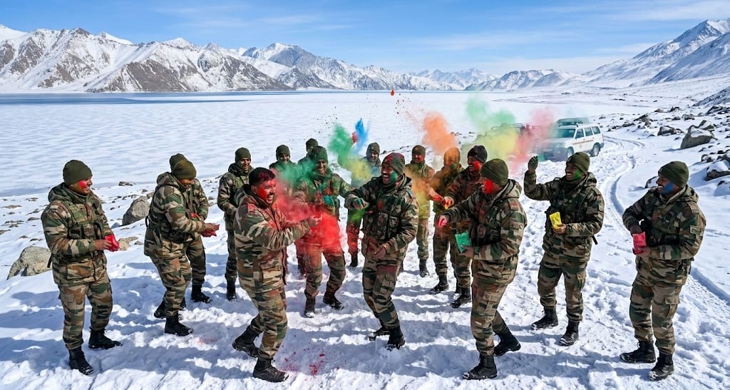 இந்திய-சீன எல்லைப் பகுதியில் அமைந்துள்ள பாங்காங் ஏரி (Pangong Lake) உலகிலேயே மிக அழகான மற்றும் சவாலான இடமாக அறியப்படுகிறது. குளிர்காலங்களில் இந்த ஏரி முழுமையாக உறைந்து போயிருக்கும் நிலையில், அதன் அருகிலேயே இந்த ஆண்டு ஹோலிப் பண்டிகை கொண்டாடப்பட்டுள்ளது. இந்த உயரமான மலைப்பகுதிகளில் ஆக்சிஜன் அளவு (Oxygen Level) மிகவும் குறைவாக இருக்கும் என்பதால், சாதாரண மனிதர்கள் நடப்பதே கடினம். ஆனால், நமது வீரர்கள் அங்கே நடனமாடி மகிழ்வது பலரையும் ஆச்சரியத்தில் ஆழ்த்தியுள்ளது.