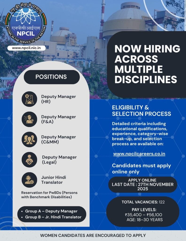 இந்திய அணுசக்தி கழகத்தில் துணை மேலாளர் மற்றும் இந்தி மொழி பெயர்ப்பாளர் பணிக்கான விண்ணப்பங்கள் பெறப்பட்டு வருகின்றன.