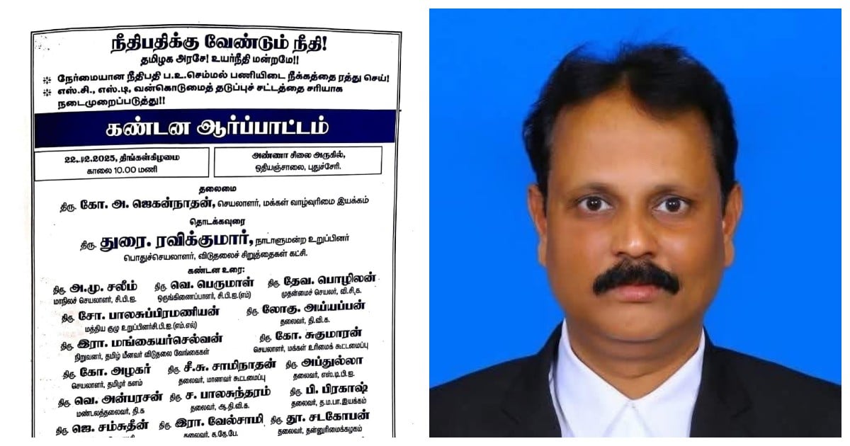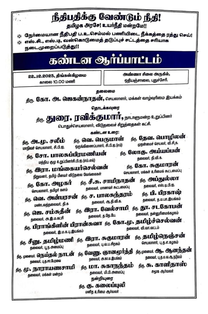 எஸ்சி/எஸ்டி வன்கொடுமை தடுப்புச் சட்டத்தை நடைமுறைப்படுத்தியதால் பணியிடை நீக்கம் செய்யப்பட்ட மாவட்ட நீதிபதி ப.உ.செம்மலுக்கு நீதி கோரி புதுச்சேரியில் சமூக, ஜனநாயக இயக்கங்கள் இன்று டிசம்பர் 22-ந் தேதி கண்டனப் போராட்டம் நடத்துகின்றன.