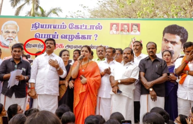மேலும், மேடையில் வைக்கப்பட்டிருந்த பேனரில் ’திறனற்ற’ என்பதற்கு பதிலாக ’திரனற்ற’ என்ற வார்த்தை பயன்படுத்தப்பட்டிருந்தது கூட தெரியாமல் ஆர்ப்பாட்டம் நடைபெற்றது குறிப்பிடத்தக்கது.