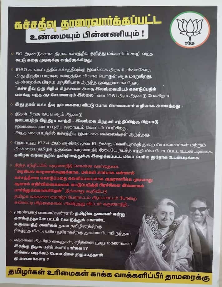 திமுகவும் காங்கிரஸும் இதை மேடைப் பேச்சோடும் பதில் அறிக்கைகளோடும் விட்டுவிட்டார்கள். ஆனால் பாஜகவோ கடற்கரை தொகுதிகள் முழுவதும் இன்று வரை கச்சத்தீவு பற்றி பிரச்சாரம் செய்து வருகிறது.