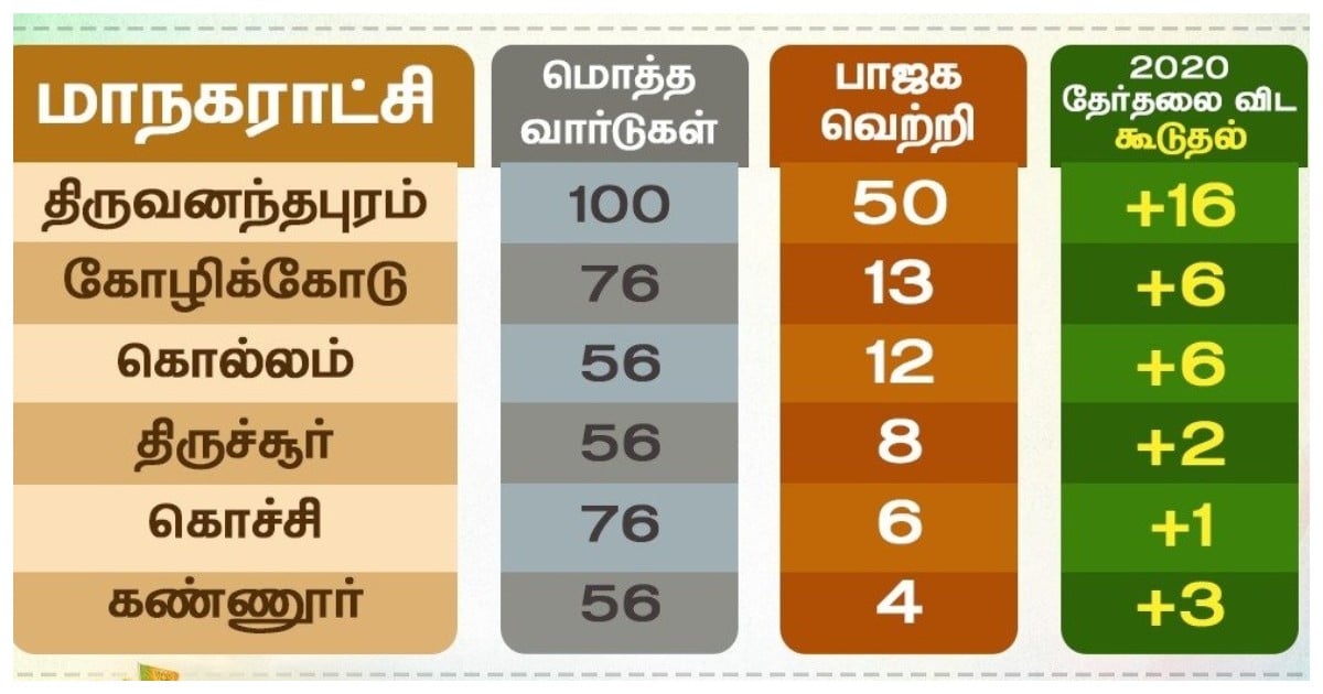 திருவனந்தபுரம் மாநகராட்சியில் மொத்தம் 100 வார்டுகள் உள்ளன. இதில் பாஜக 50-ல் வெற்றி பெற்றுள்ளது. 2020-ம் ஆண்டு தேர்தலை ஒப்பிடுகையில் 16 இடங்களை கூடுதலாக பெற்றுள்ளது பாஜக.