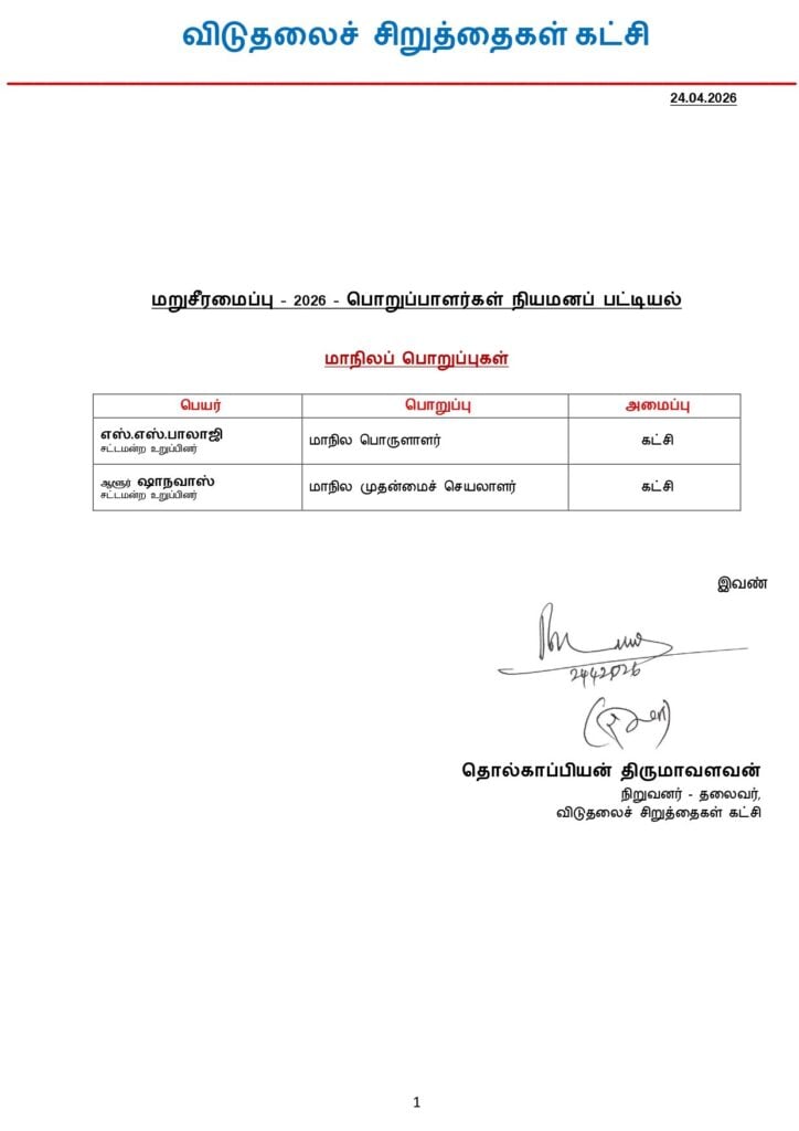 விடுதலை சிறுத்தைகள் கட்சியின் மாநில பொருளாளராக எஸ்.எஸ்.பாலாஜி நியமிக்கப்பட்டுள்ளார். மாநில முதன்மைச் செயலாளராக ஆளூர் ஷாநவாஸ் நியமிக்கப்பட்டுள்ளார்.