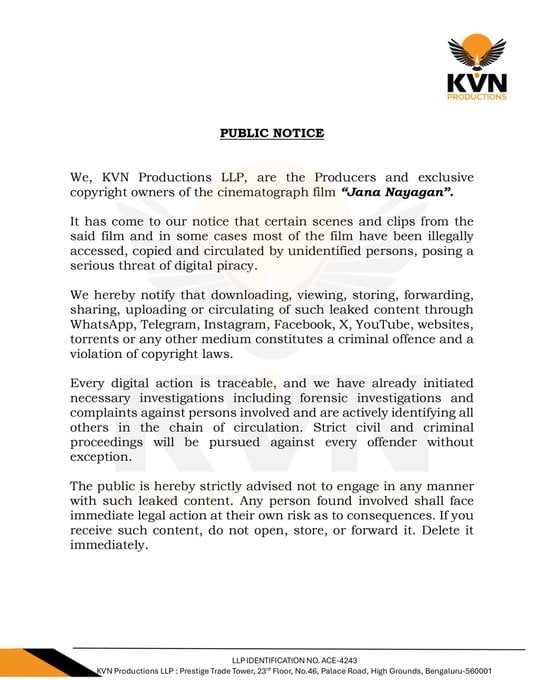 விஜய்யின் ஜனநாயகன் படத்தை வாஸ்அப், பேஸ்புக், யூடியூப் என எந்த விதத்தில் பகிர்ந்தாலும் சட்டநடவடிக்கை எடுக்கப்படும் என கே.வி.என்.தயாரிப்பு நிறுவனம் தெரிவித்துள்ளது.