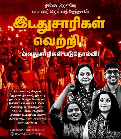 டெல்லியில் உள்ள புகழ்பெற்ற ஜவஹர்லால் நேரு பல்கலைக் கழகம் (JNU)-வில் நடைபெற்ற மாணவர் சங்கத் தேர்தலில் (JNU Student Union Elections) இடதுசாரி இயக்கங்களின் மாணவர்கள் பிரம்மாண்ட வெற்றியைப் பெற்றுள்ளனர். பாஜகவின் மாணவர் அமைப்பான ஏபிவிபி படுதோல்வி அடைந்துள்ளது.