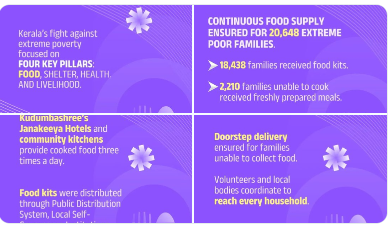 2021இல் தொடங்கப்பட்ட மாநிலத்தின் தீவிர வறுமை ஒழிப்புத் திட்டம், மேலிருந்து கீழே அமலாக்கப்படும் நலத்திட்டமாகக் கருதப்படவில்லை, மாறாகப் பங்கேற்பு இயக்கமாகக் கருதப்பட்டது. மிகவும் ஏழ்மையான குடும்பங்களை அடையாளம் காணும் செயல்முறை உள்ளூர் மட்டத்தில் தொடங்கியது. இதில் பஞ்சாயத்துப் பிரதிநிதிகள், 1998இல் தொடங்கப்பட்ட குடும்பஸ்ரீ வறுமை ஒழிப்புத் திட்டத்தின் பணியாளர்கள், தன்னார்வலர்கள், அதிகாரிகள் ஆகியோர் பங்கேற்றனர்.