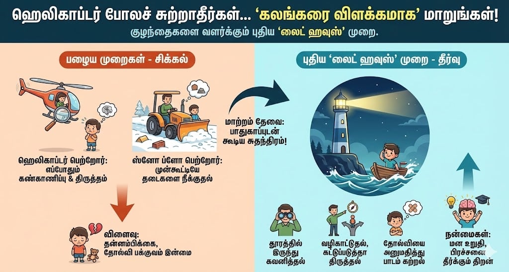 இத்தனை நாட்களாகப் பிரபலமாக இருந்த ‘ஹெலிகாப்டர்’ மற்றும் ‘ஸ்னோ ப்ளோ’ (Snowplow) வளர்ப்பு முறைகளைத் தூக்கி எறிந்துவிட்டு, இப்போது உலகம் ‘லைட் ஹவுஸ்’ (Lighthouse Parenting) முறைக்கு மாறி வருகிறது.