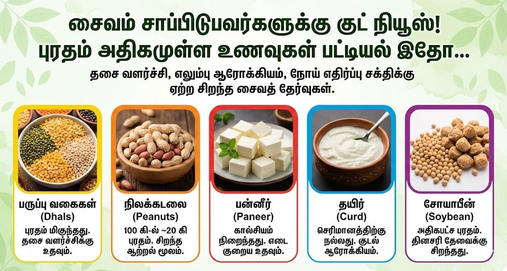புரதங்கள் அதிகமுள்ள சைவ உணவுகள் (Protein rich Vegetarian foods): சைவ உணவு உண்பவர்களுக்கு, உடலின் புரதத் தேவையைப் பூர்த்தி செய்ய, புரதம் நிறைந்த சில உணவுகள் தேவைப்படுகின்றன. சில சைவ உணவுகளில் புரதச் சத்துக்கள் அதிகளவில் நிறைந்துள்ளன. பருப்பு வகைகள், பன்னீர், நிலக்கடலை, தயிர் போன்ற சைவ உணவுகள் புரதச்சத்து நிறைந்தவை. இவற்றை நம் அன்றாட உணவில் சேர்ப்பதன் மூலம், உடலை வலுப்படுத்துவது மட்டுமல்லாமல், நோய் எதிர்ப்பு சக்தியையும் அதிகரிக்க முடியும்.