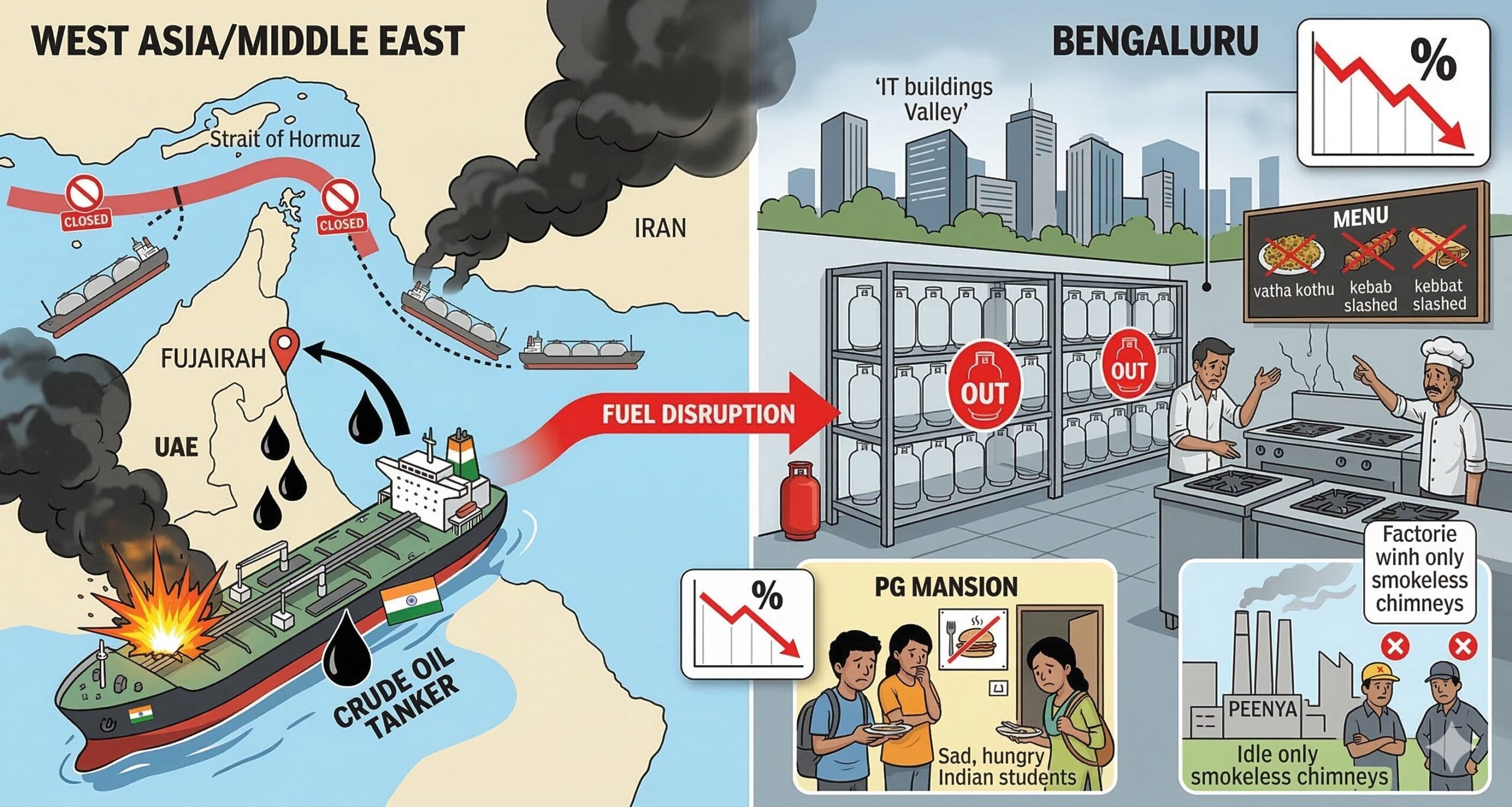மத்திய கிழக்கில் (West Asia) நிலவும் போர்ச் சூழல், இந்தியாவின் சிலிக்கான் வேலியான பெங்களூருவின் உணவகத் தொழிலை நிலைகுலையச் செய்துள்ளது. வர்த்தக ரீதியாகப் பயன்படுத்தப்படும் எல்பிஜி சிலிண்டர்களின் விநியோகம் முடங்கியுள்ளதால், நகரின் ஓட்டல் வர்த்தகம் கடந்த ஒரு வாரத்தில் மட்டும் 30% சரிவைக் கண்டுள்ளது.