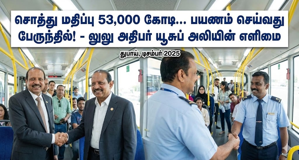 வைரலாகும் பேருந்து பயணம்: பொதுவாகப் பணக்காரர்கள் என்றாலே சொகுசு கார்கள், தனி விமானங்கள் என்றுதான் நாம் பார்த்திருப்போம். ஆனால், எம்.ஏ. யூசுப் அலி துபாயில் சாதாரண பொதுப் பேருந்தில் (Public Bus) பயணம் செய்துள்ளார். டிசம்பர் 14, 2025 அன்று வெளியான இந்த வீடியோவில், கோட்-சூட் அணிந்தபடி பேருந்தில் ஏறும் அவர், எந்தவித பந்தாவும் இல்லாமல் ஓட்டுநரை நோக்கிச் செல்கிறார்.