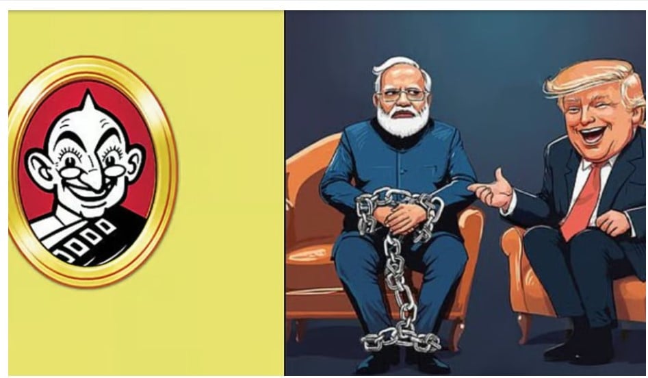 அமெரிக்க அதிபர் டொனால்ட் டிரம்புக்கு அருகில் பிரதமர் மோடி சங்கிலியால் கட்டப்பட்ட நிலையில் அமர்ந்திருப்பது போன்ற கார்ட்டூன் ஆனந்த விகடனின் இணைய இதழான விகடன் பிளஸ் இதழில் வெளியானது.