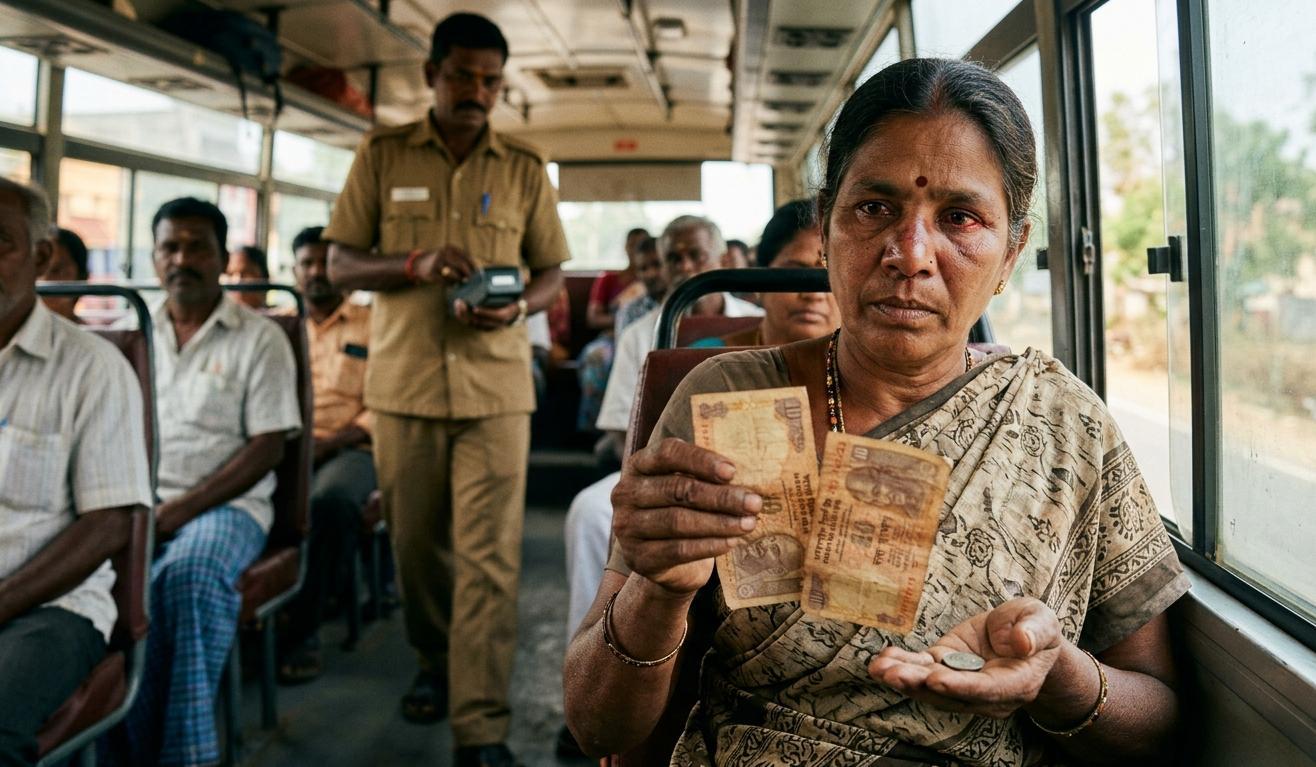 பேருந்து கட்டணத்திற்கு இரண்டு ரூபாய் போதவில்லை. இப்போது கையில் ஒரு ரூபாய் கூட இல்லை. ஆனாலும் “ஏற்பது இகழ்ச்சி” என்ற நிலைப்பாட்டில் உறுதியாக இருந்தார். “அரசு பேருந்து இருக்கிறது; அந்த மகராசன் இருக்கிறான்” என்ற நம்பிக்கை, தமிழ்நாட்டில் வாழும் இத்தகைய அபலைப் பெண்களுக்கு எவ்வளவு பெரிய பலம்!