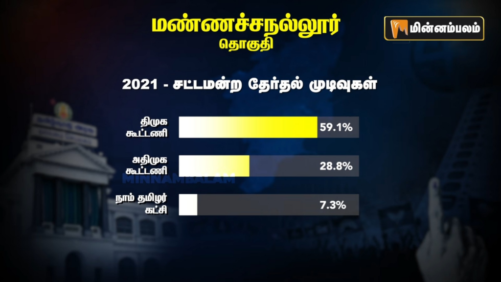 அடுத்ததா மண்ணச்சநல்லூர்.. போன 2021-ல் திமுக வேட்பாளராக வெற்றி பெற்ற கதிரவன் மீண்டும் இங்கே போட்டியிடுகிறார். அதிமுக வேட்பாளராக பரதன் போட்டியிடுகிறார். 2021-ல் கதிரவன் 59,618 வாக்குகள் வித்தியாசத்தில் ஜெயிச்சிருந்தாரு.