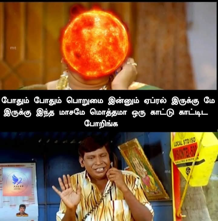 நண்பன், “மச்சி… என்னாமா வெயில் அடிக்குது. ஒரு நாளைக்கு மூணு டைம் குளிக்க வேண்டியிருக்குன்னு” உச் கொட்டுனான்.
