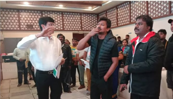 சென்னை மாநகராட்சி மையத்தில் அமைக்கப்பட்டுள்ள கட்டுப்பாட்டு அறையில் விளையாட்டு மேம்பாட்டு துறை அமைச்சர் உதயநிதி ஸ்டாலின் இன்று (டிசம்பர் 4) ஆய்வு செய்தார்.