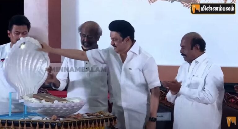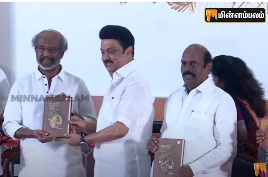 அந்த சிப்பியை திறந்து புத்தகத்தை ஸ்டாலின் வெளியே எடுத்தார். பின்னர் நூலின் முதல் பிரதியை ஸ்டாலின் வெளியிட நடிகர் ரஜினிகாந்த் பெற்றுக்கொண்டார்.