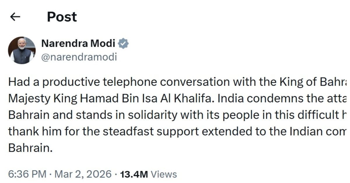 இந்த உரையாடல் தொடர்பாக சமூக ஊடக எக்ஸ் தளத்தில் பிரதமர் மோடி, பஹ்ரைன் அரசர் மன்னர் ஹமத் பின் இசா அல் கலீஃபாவுடன் ஒரு ஆக்கப்பூர்வமான தொலைபேசி உரையாடலை மேற்கொண்டேன். பஹ்ரைன் மீதான தாக்குதல்களை இந்தியா கண்டிப்பதுடன், இந்தத் துயரமான தருணத்தில் அந்நாட்டு மக்களுக்கு இந்தியா முழு ஆதரவையும் வழங்குகிறது. பஹ்ரைனில் உள்ள இந்திய மக்களுக்கு அளித்த உறுதியான ஆதரவிற்காக நான் அவருக்கு நன்றி தெரிவிக்கிறேன் என தெரிவித்துள்ளார்.