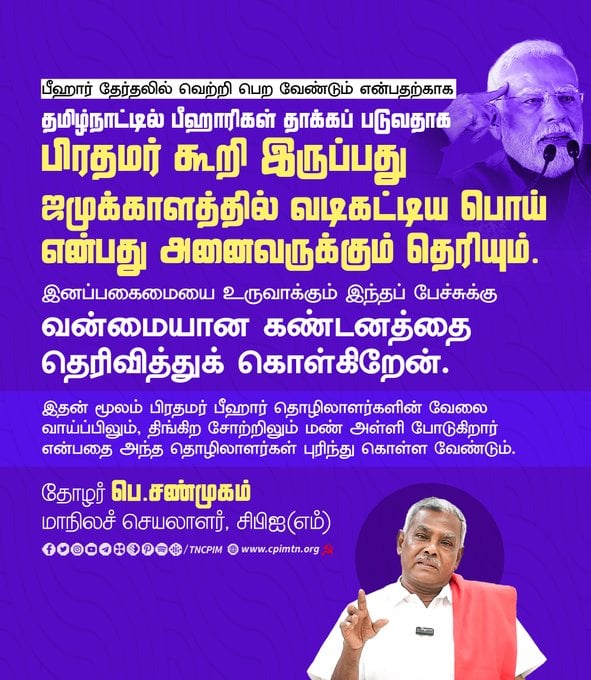 சிபிஎம் மாநிலச் செயலாளர் பெ. சண்முகம்: பீஹார் தேர்தலில் வெற்றி பெற வேண்டும் என்பதற்காக தமிழ்நாட்டில் பீஹாரிகள் தாக்கப் படுவதாக பிரதமர் கூறி இருப்பது ஜமுக்காளத்தில் வடிகட்டிய பொய் என்பது அனைவருக்கும் தெரியும். இனப்பகைமையை உருவாக்கும் இந்தப் பேச்சுக்கு வன்மையான கண்டனத்தை தெரிவித்துக் கொள்கிறேன். இதன் மூலம் பிரதமர் பீஹார் தொழிலாளர்களின் வேலை வாய்ப்பிலும், திங்கிற சோற்றிலும் மண் அள்ளி போடுகிறார் என்பதை அந்த தொழிலாளர்கள் புரிந்து கொள்ள வேண்டும்.