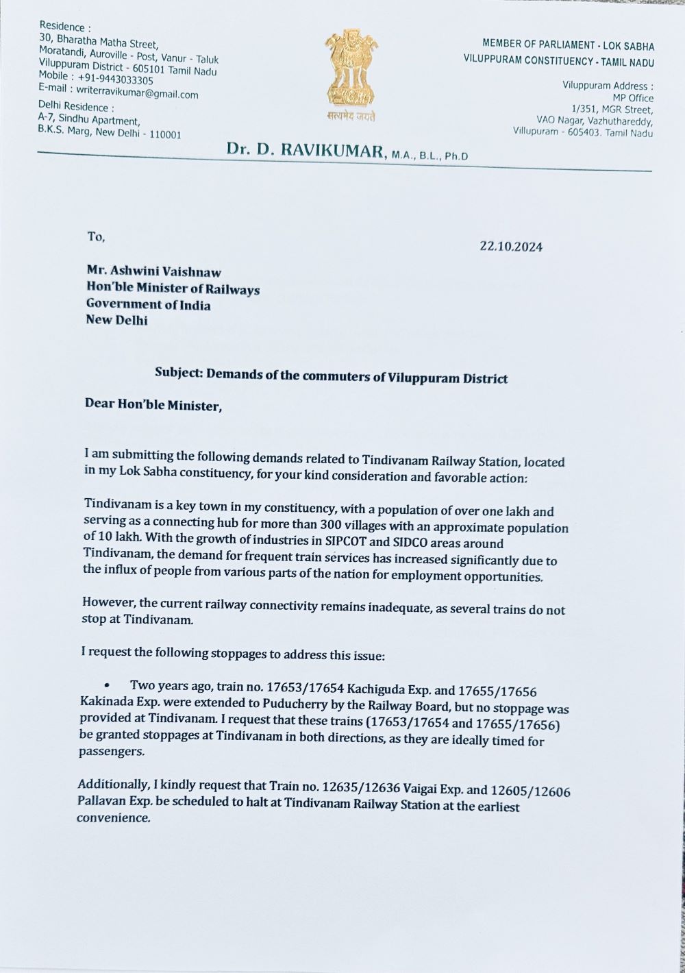 அவர்களின் கடிதத்தை பெற்றுக்கொண்ட எம்பி ரவிக்குமார், இது தொடர்பாக மத்திய ரயில்வேதுறை அமைச்சர் அஸ்வினி வைஷ்ணவுக்கு நேற்று(அக்டோபர் 22) கடிதம் எழுதியுள்ளார்.