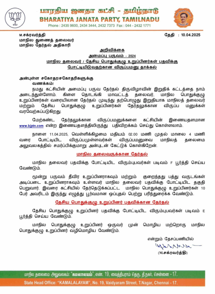 ஏப்ரல் 11 ஆம் தேதி பிற்பகல் 2 மணி முதல் மாலை 4 மணி வரை மாநில தலைமை அலுவலகமான கமலாலயத்தில் விருப்ப மனுக்கள் தரப்பட உள்ளன. இந்த அடிப்படையில் ஏப்ரல் 12ஆம் தேதி சனிக்கிழமை மாநில தலைவருக்கான தேர்தல் சென்னை வானகரத்திலே அமைந்திருக்க கூடிய ஸ்ரீ வாரு கல்யாண மண்டபத்தில் நடைபெற இருக்கிறது. இந்த நிகழ்வில் நயினார் நாகேந்திரன் பாஜகவின் புதிய மாநில தலைவராக தேர்ந்தெடுக்கப்பட இருக்கிறார்.