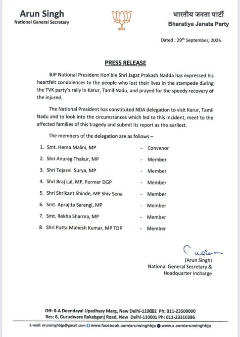 இந்த நிலையில் இன்று தேசிய ஜனநாயக் கூட்டணி சார்பில் நெரிசல் சம்பவம் குறித்து ஆய்வு மேற்கொள்ள ஹேமமாலினி எம்.பி தலைமையில் 8 பேர் அடங்கிய குழுவை அமைத்து ஜே.பி.நட்டா உத்தரவிட்டுள்ளர். இந்த குழு நாளை அல்லது நாளை மறுதினம் நேரடியாக கரூர் வந்து பாதிக்கப்பட்டவர்களின் குடும்பங்களை நேரில் சந்தித்து ஆய்வு மேற்கொள்ளும் என கூறப்படுகிறது.