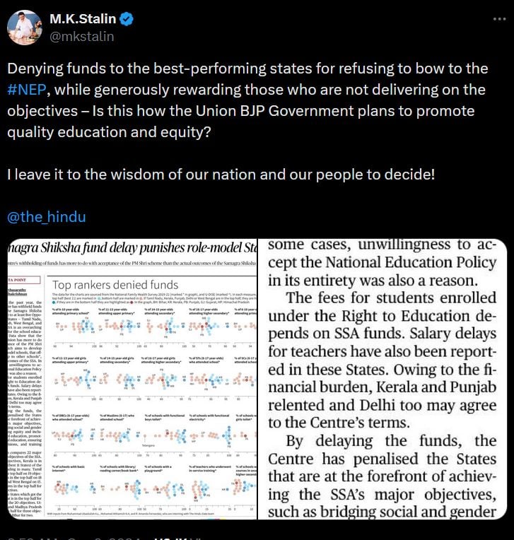இந்தச் செய்தியை மேற்கோள் காட்டி, மத்தியில் ஆளும் பாஜக அரசை முதல்வர் ஸ்டாலின் எக்ஸ் தளத்தில் விமர்சித்திருந்தார்.